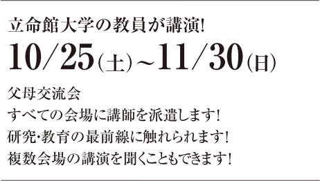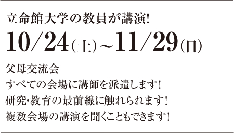 父母教育後援会では、保護者の皆さまと立命館大学との絆を深める様々なイベントを実施しています。 特に春は、日本全国の会場で開催する父母交流会や各キャンパスで実施する春のオープンカレッジなど、大きなイベントが豊富です。 大学や学生生活のことを知るだけでなく、立命館大学の知に触れられる絶好の機会なので、ぜひお気軽にご参加ください。